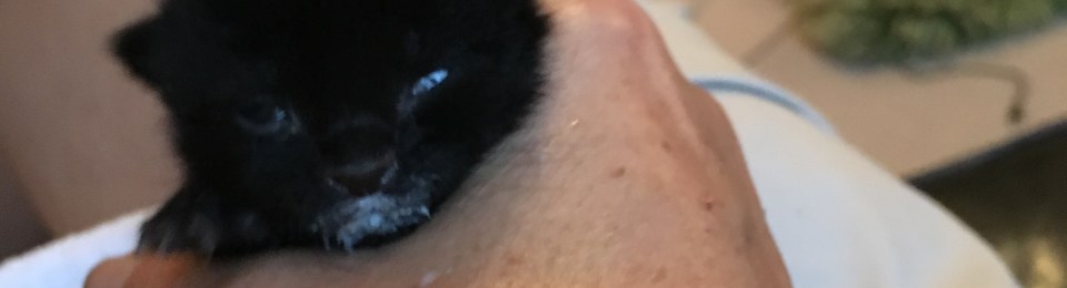 We found the kitten in wet grass late Friday afternoon, with its umbilical cord attached and its eyes still shut.